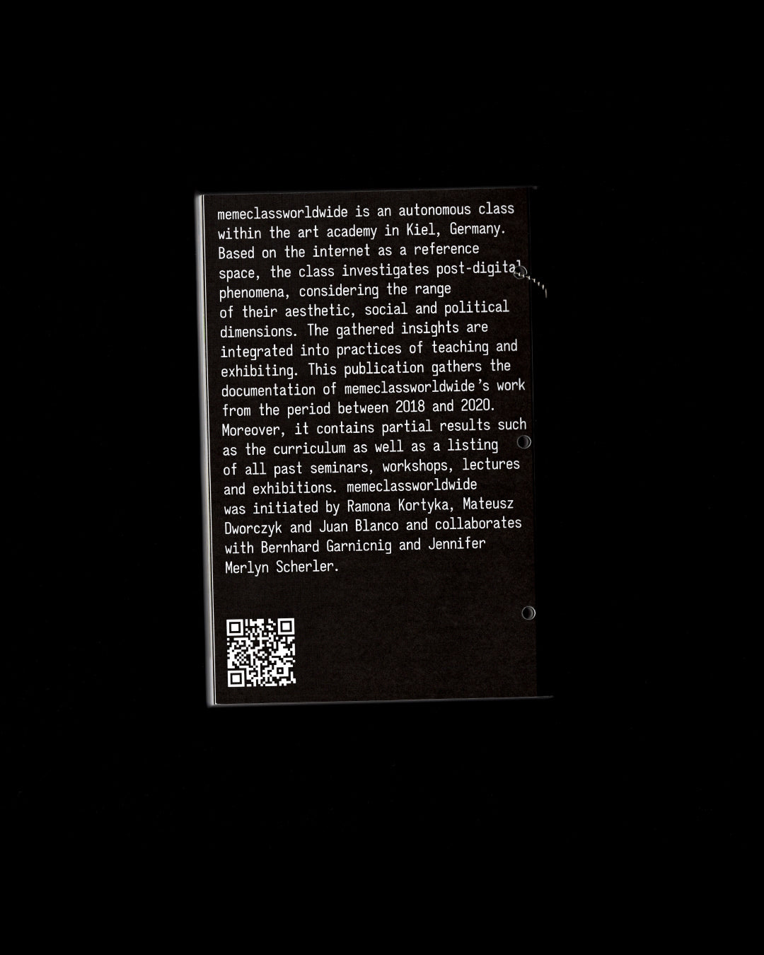 memeclassworldwide is an autonomous classwithin the art academy in Kiel, Germany. Based on the internet as a reference space,the class investigates post-digital phenomena, considering the range of their aesthetic, social and political dimensions. The gathered insights are integrated into practices of teaching and exhibiting. This publication gathers the documentation of memeclassworldwide's work from the period between 2018 and 2020. Moreover, it contains partial results such as the curriculum as well as a listing of all past seminars, workshops, lectures and exhibitions memeclassworldwide was initiated by Ramona Kortyka, Mateusz Dworczyk and Juan Blanco and collaborates with Bernhard Garnicnig and Jennifer Merlyn Scherler.